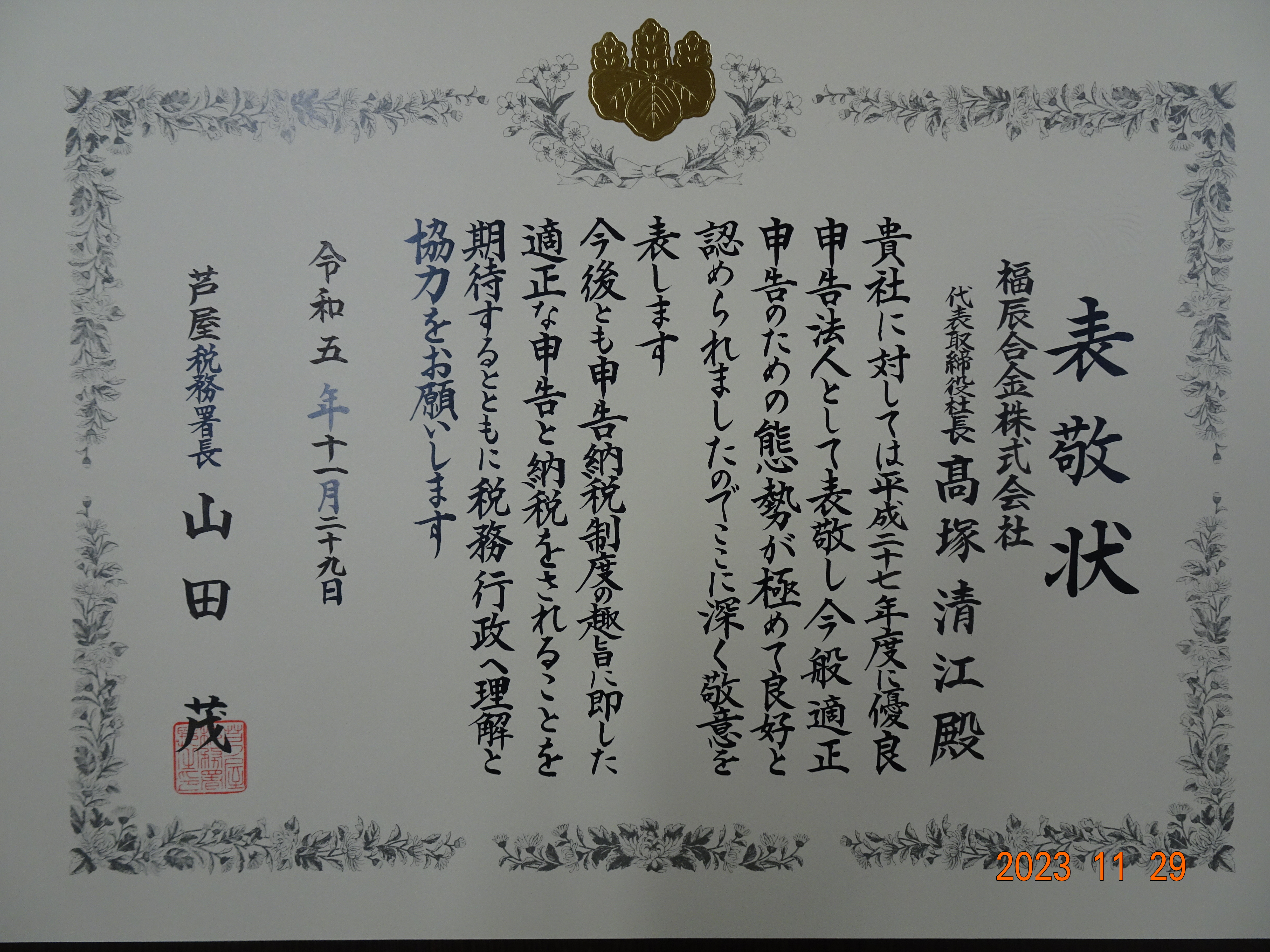 令和5年11月29日芦屋税務署より優良申告法人として表敬を受け、表敬状を授与されました。平成27年度に優良申告法人として表敬を受け、この度適正申告のための態勢が極めて良好と認められました。今後も優良申告法人として優良経営、適正申告・納税に努めて参ります。